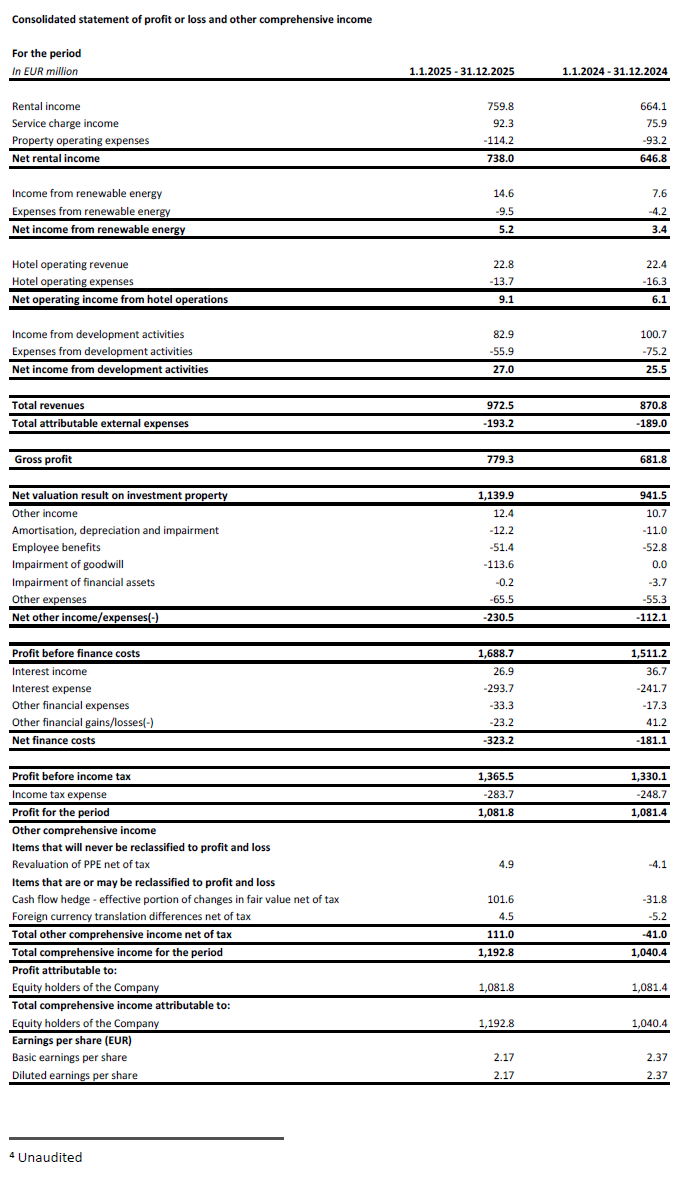 Rental income in 2025 amounted to €759.8 million, up 14.4% y-o-y on an absolute basis, mainly driven by deliveries and like-for-like growth. On a like-for-like basis, rental income grew 4.5%, thanks to indexation and reversion on renegotiations and expiring leases.